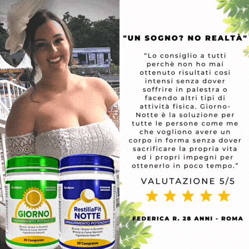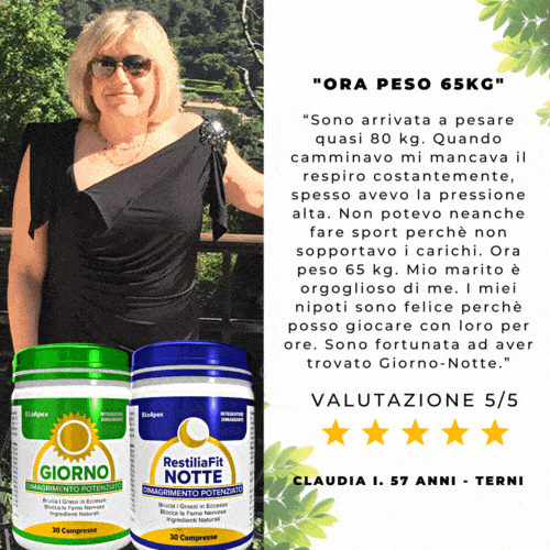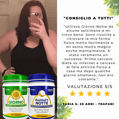 “Grazie a Giorno-Notte sono finalmente riuscita a buttare giù quei chili di troppo contro cui combatto da anni. E’ bastato assumere due compresse al giorno per vedere gradualmente i centimetri diminuire… Sono molto soddisfatta, dopo aver provato tante soluzioni e tante diete sono riuscita a perdere peso praticamente senza sforzi.”